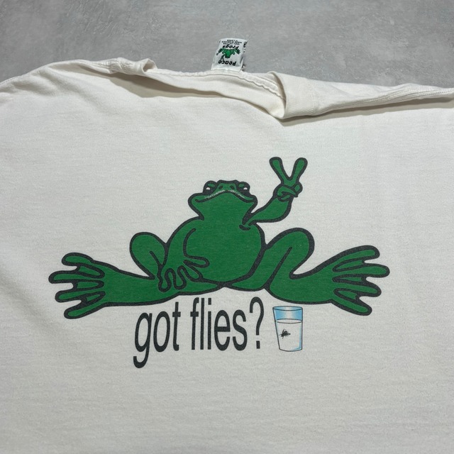 【サイズ】 タグ表記 XL 着丈74cm 肩幅55cm 身幅59cm 袖丈21.5cm 【状態】若干の毛羽立ち有り フロント薄汚れ有り 着用自体には差し支えのない良コンディション 古着に理解ある方のみご検討ください! "got milk?パロディー" 本当に色々な物がありますが、1発嬉しいグラフィックが入るやつ◎ しかもgot files?(閉じ込め足りてる?的な?笑) 笑 でカエルのピース笑 しかもちゃんと牛乳に入れてカエルも牛乳飲んだ跡が口元に。笑 これかなりツボでしたね〜 タグもオリジナルタグで激可愛。 メキシコ製なので00掛かってるかもしれせんが、触った感じはギリ90なんじゃないかなと。 ボディーのクオリティー、プリントパターン サイズもしっかりXLと、バックメインのグラフィックを着る上で嬉しい条件 めちゃくちゃ良いっす^^ 【Humor cloth】