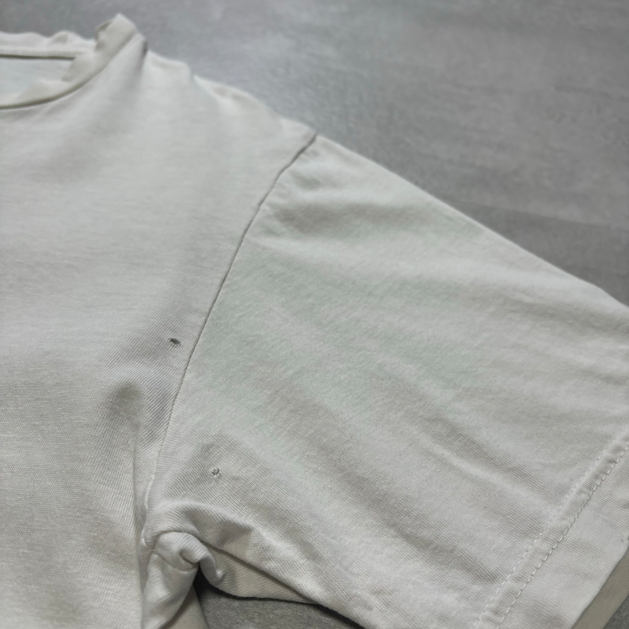 黒い点の汚れがフロント腹部・襟・右袖の後ろ側にございます。タグが外れかけています。
