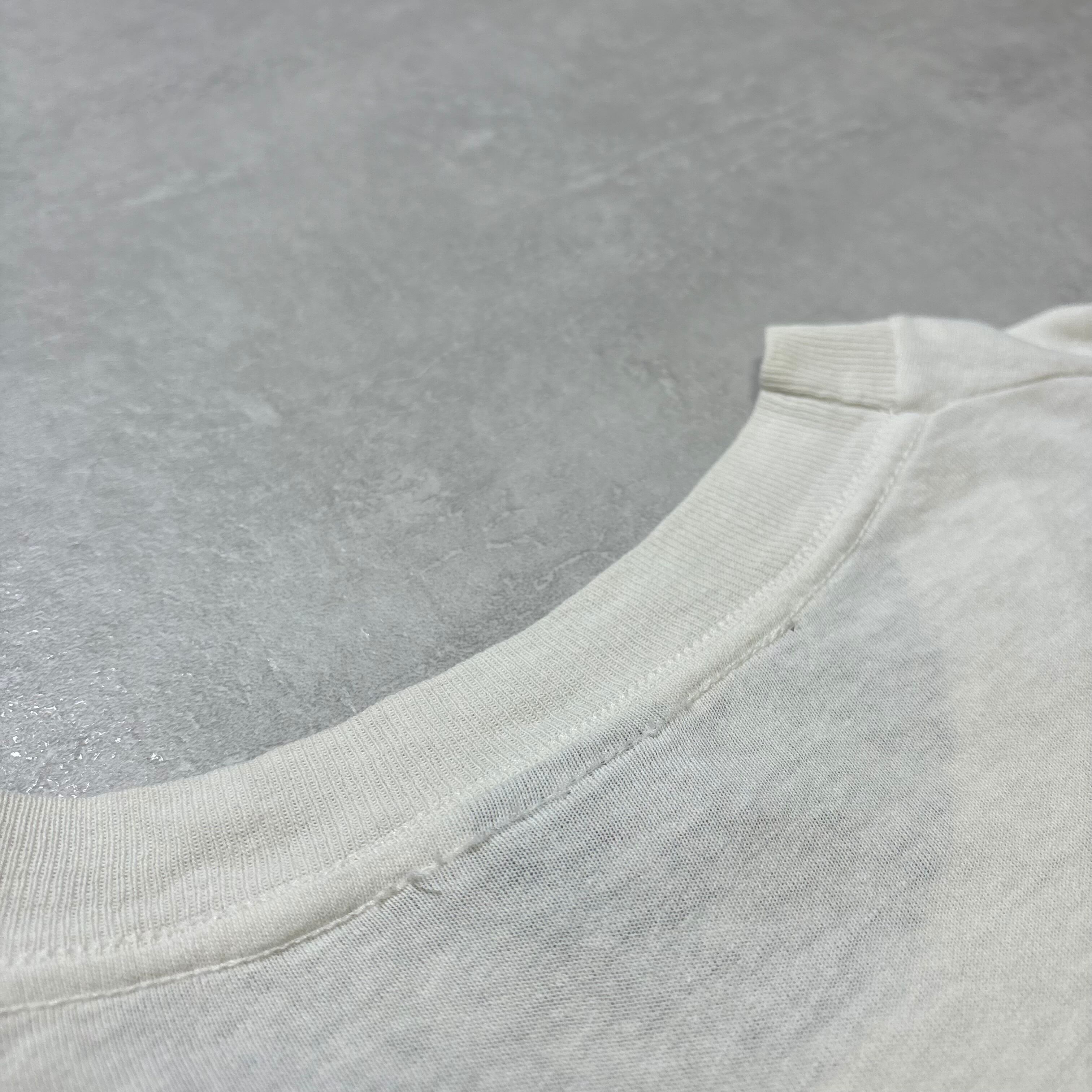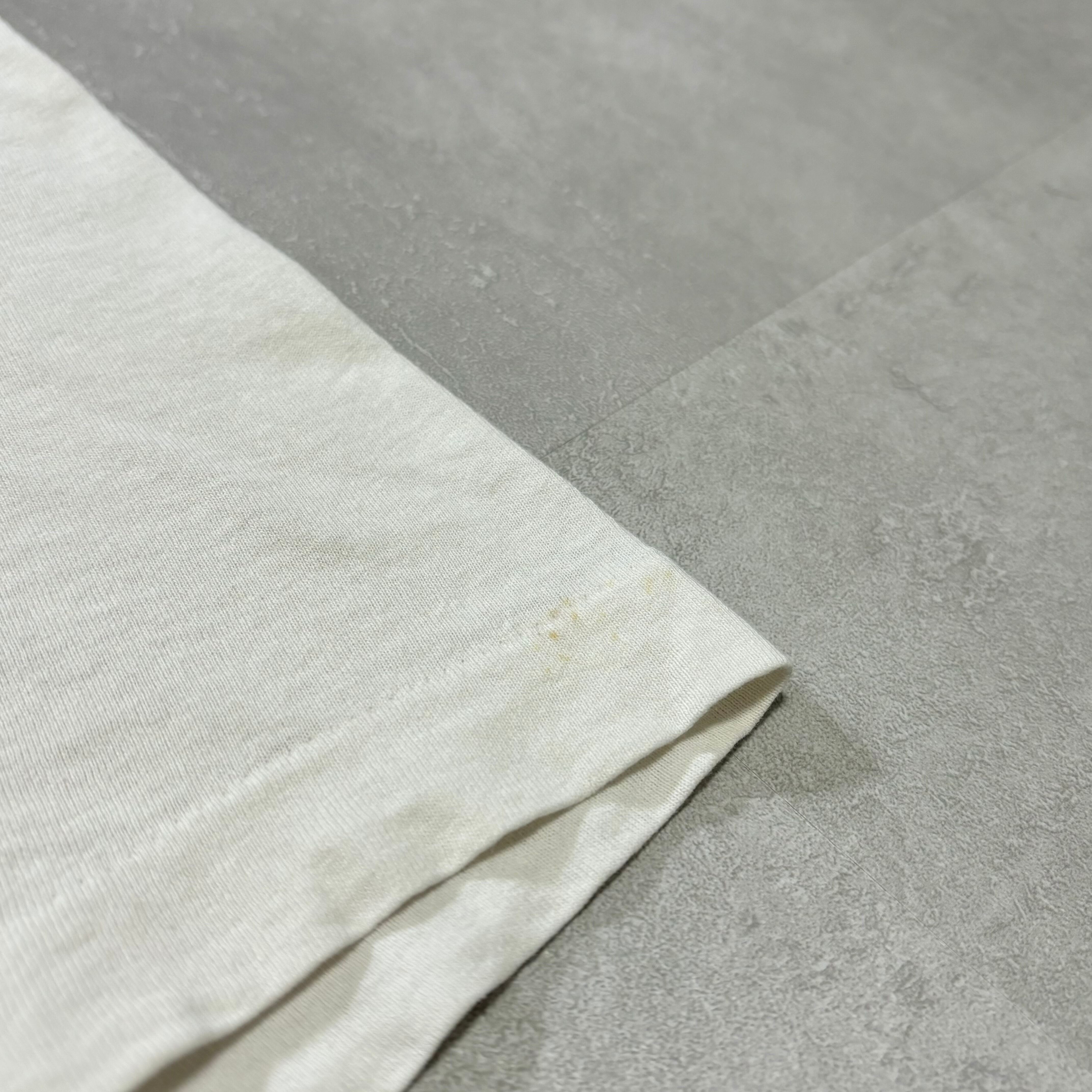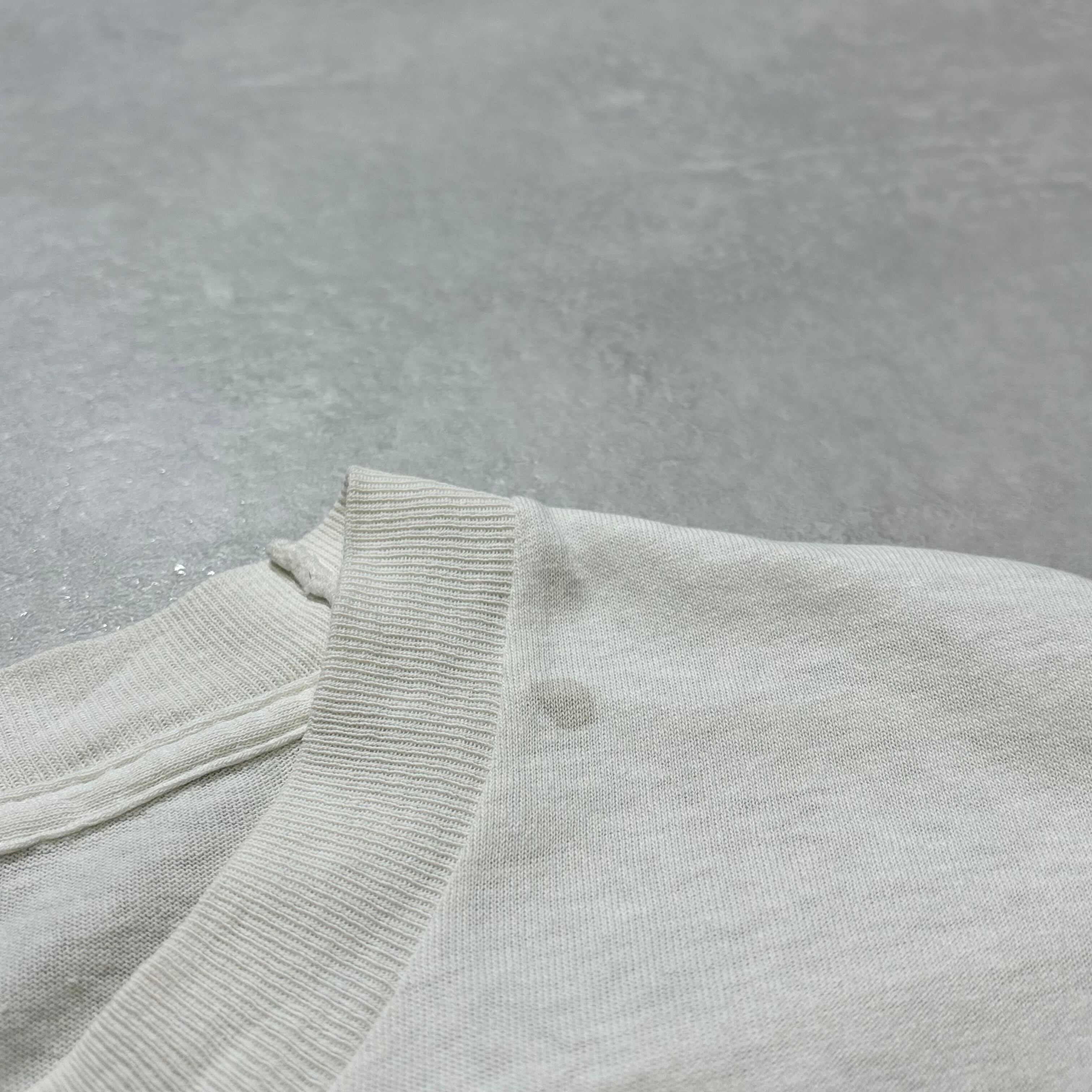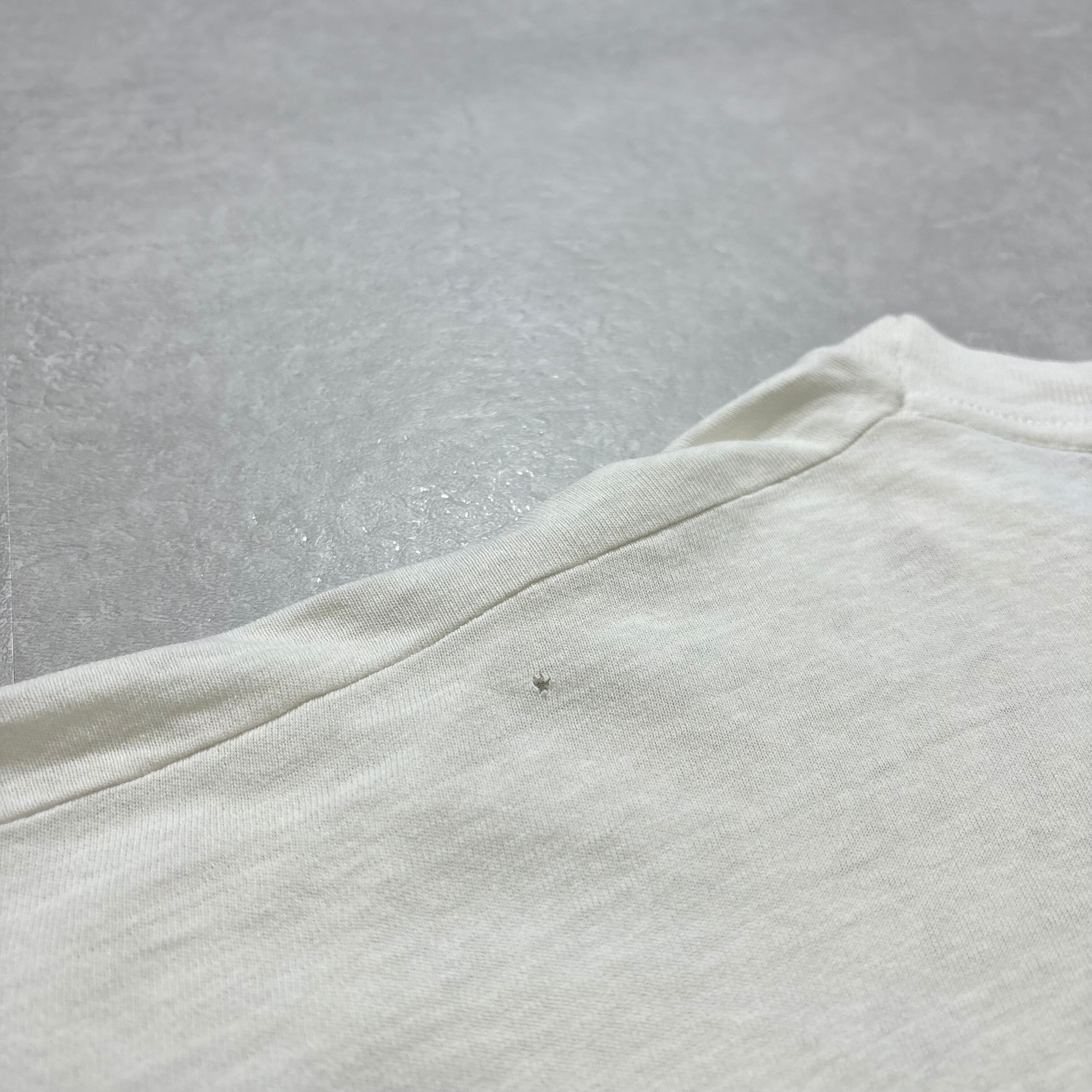フロント左鎖骨付近に一カ所ピンホール、シミがございます。左袖に薄汚れ有り。腹部にもインク飛びのような薄い汚れ有り。