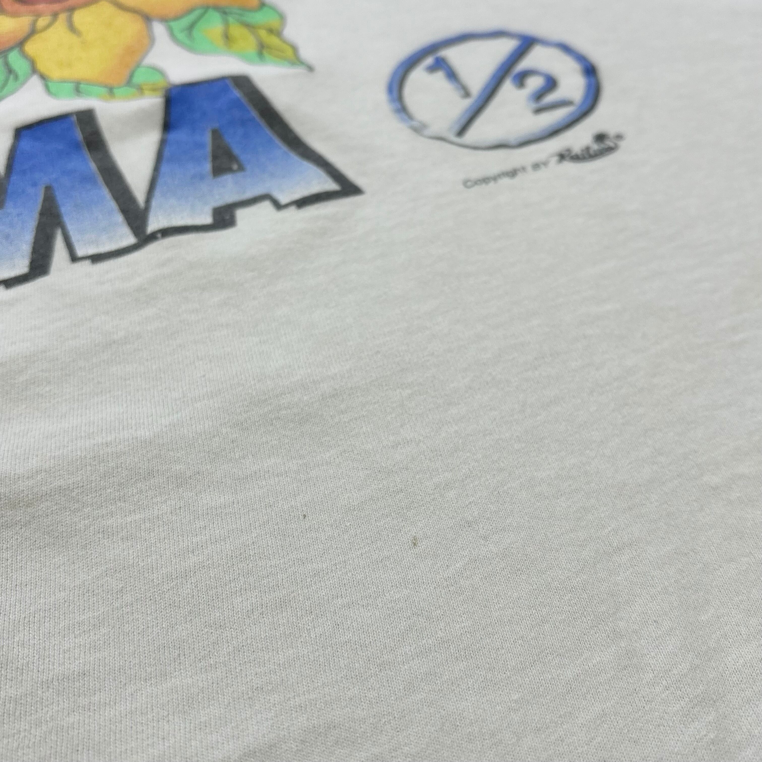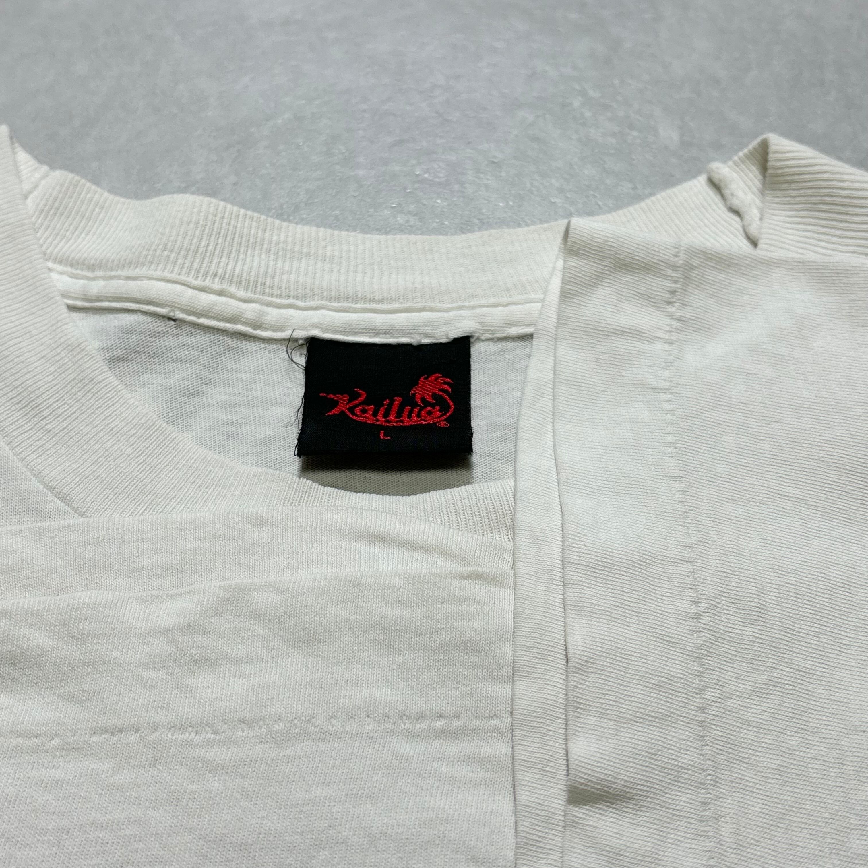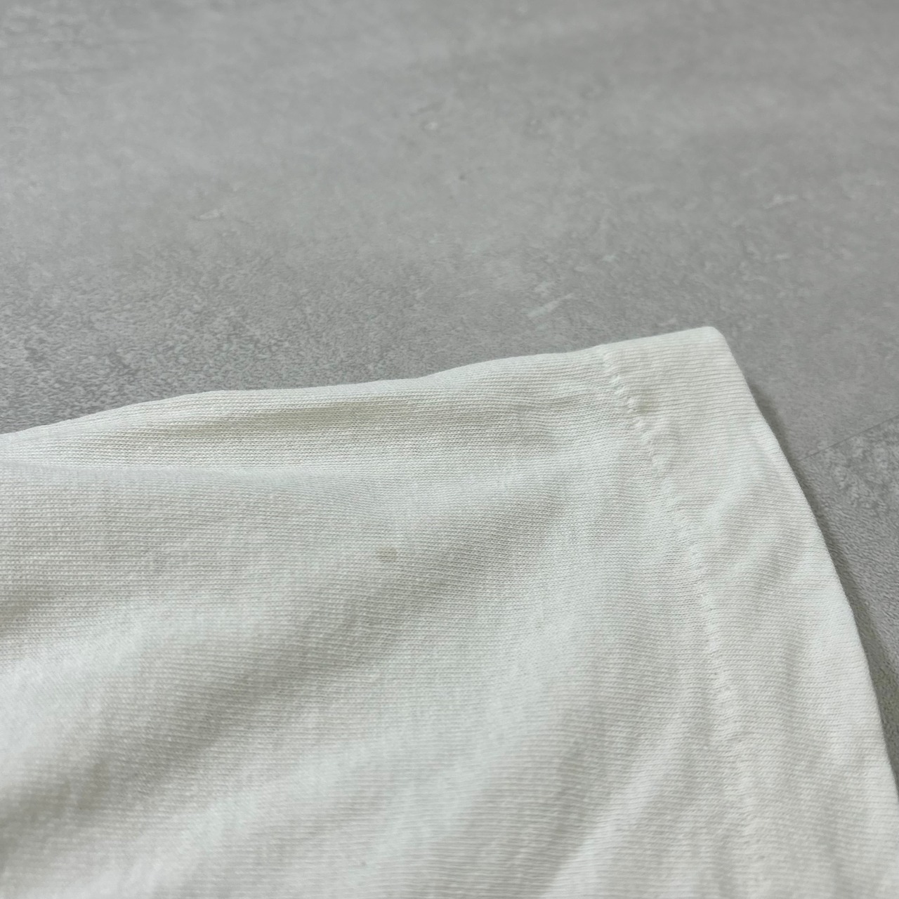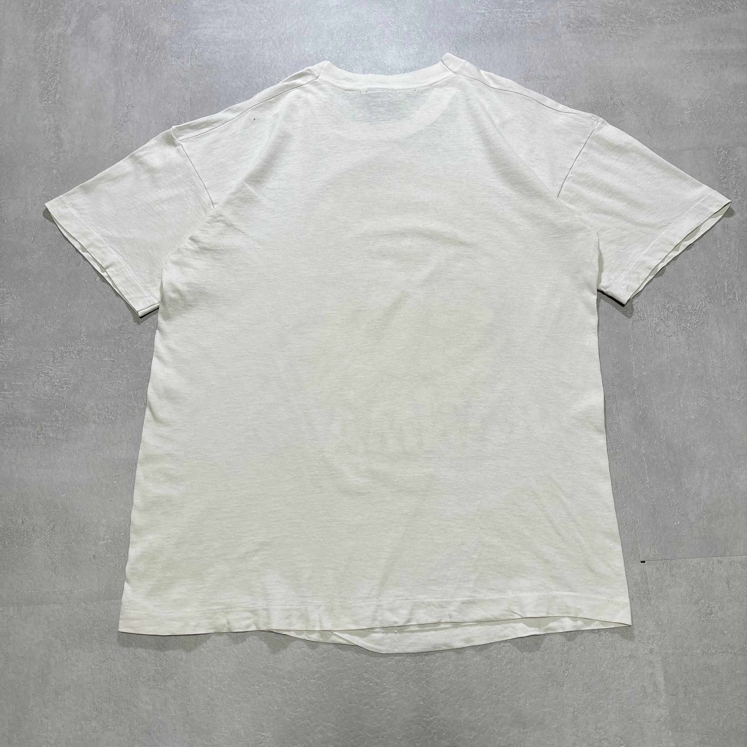 フロント左鎖骨付近に一カ所ピンホール、シミがございます。左袖に薄汚れ有り。腹部にもインク飛びのような薄い汚れ有り。