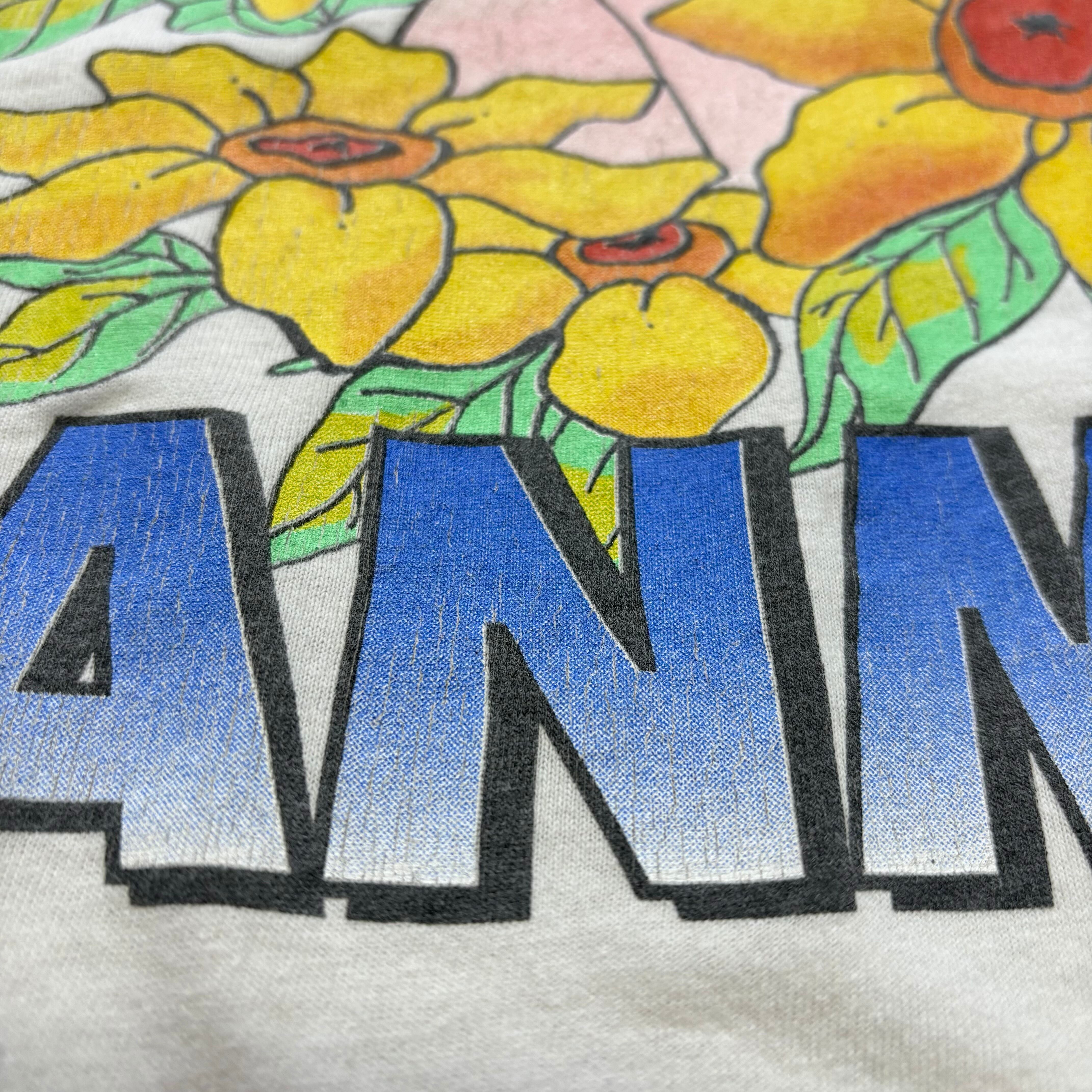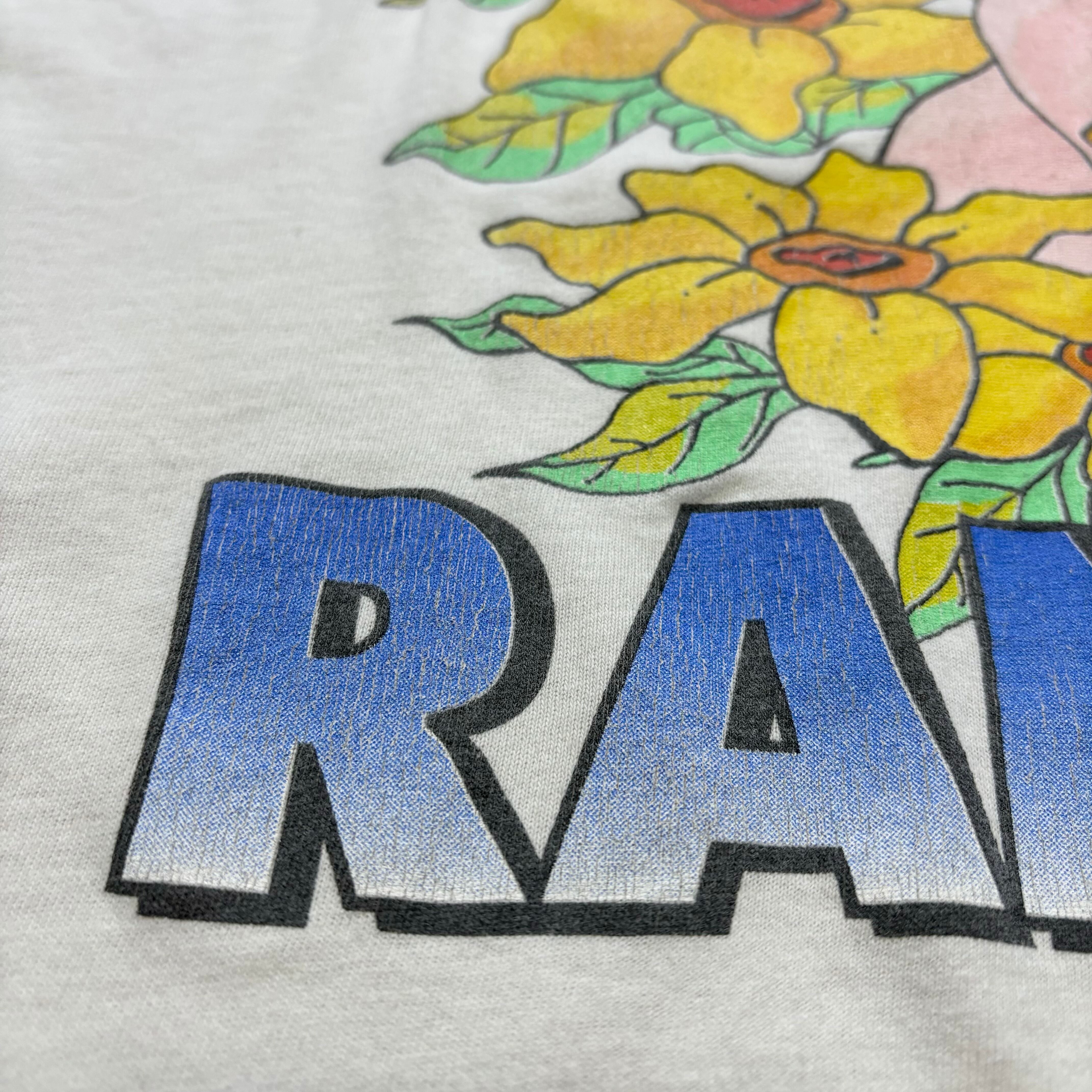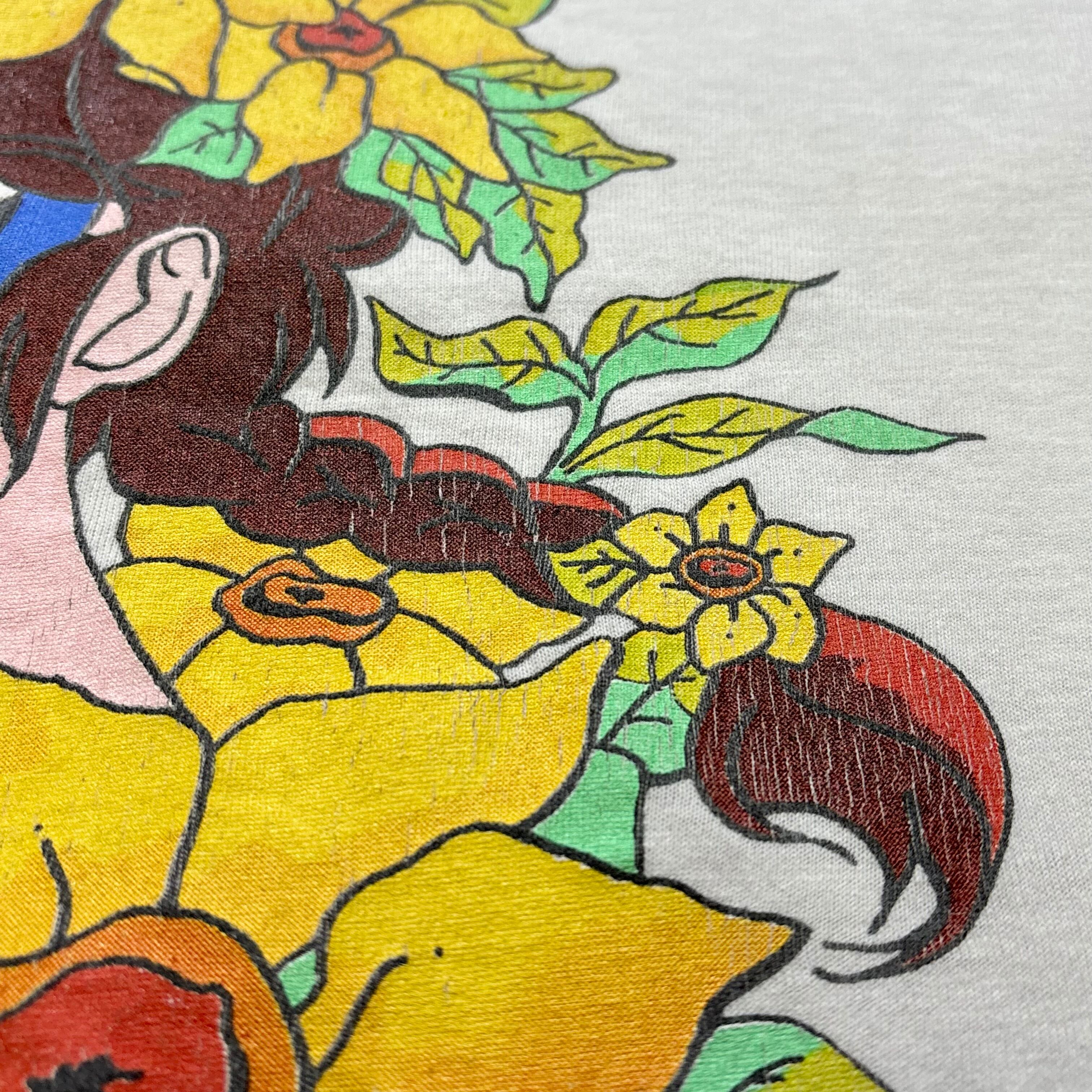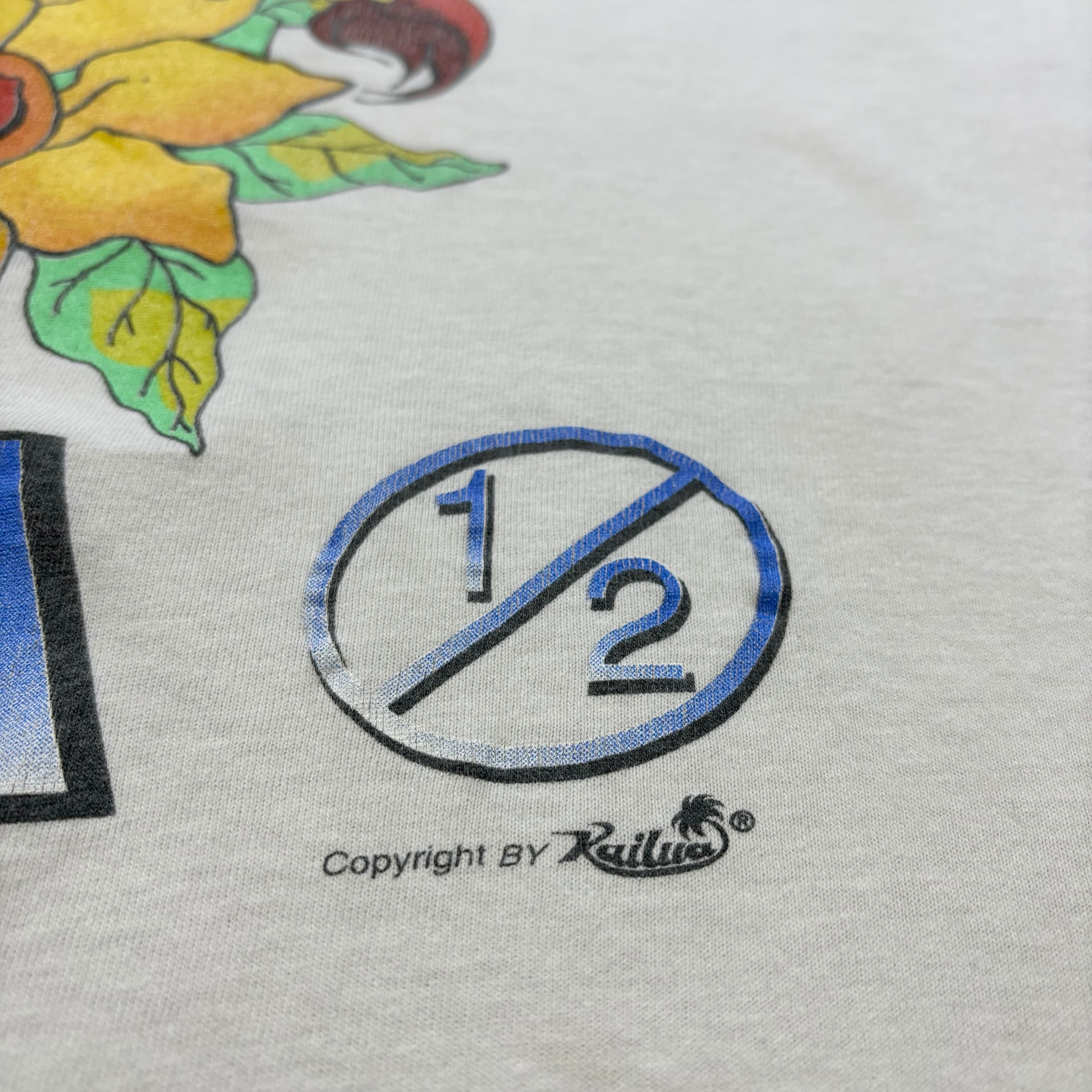 フロント左鎖骨付近に一カ所ピンホール、シミがございます。左袖に薄汚れ有り。腹部にもインク飛びのような薄い汚れ有り。