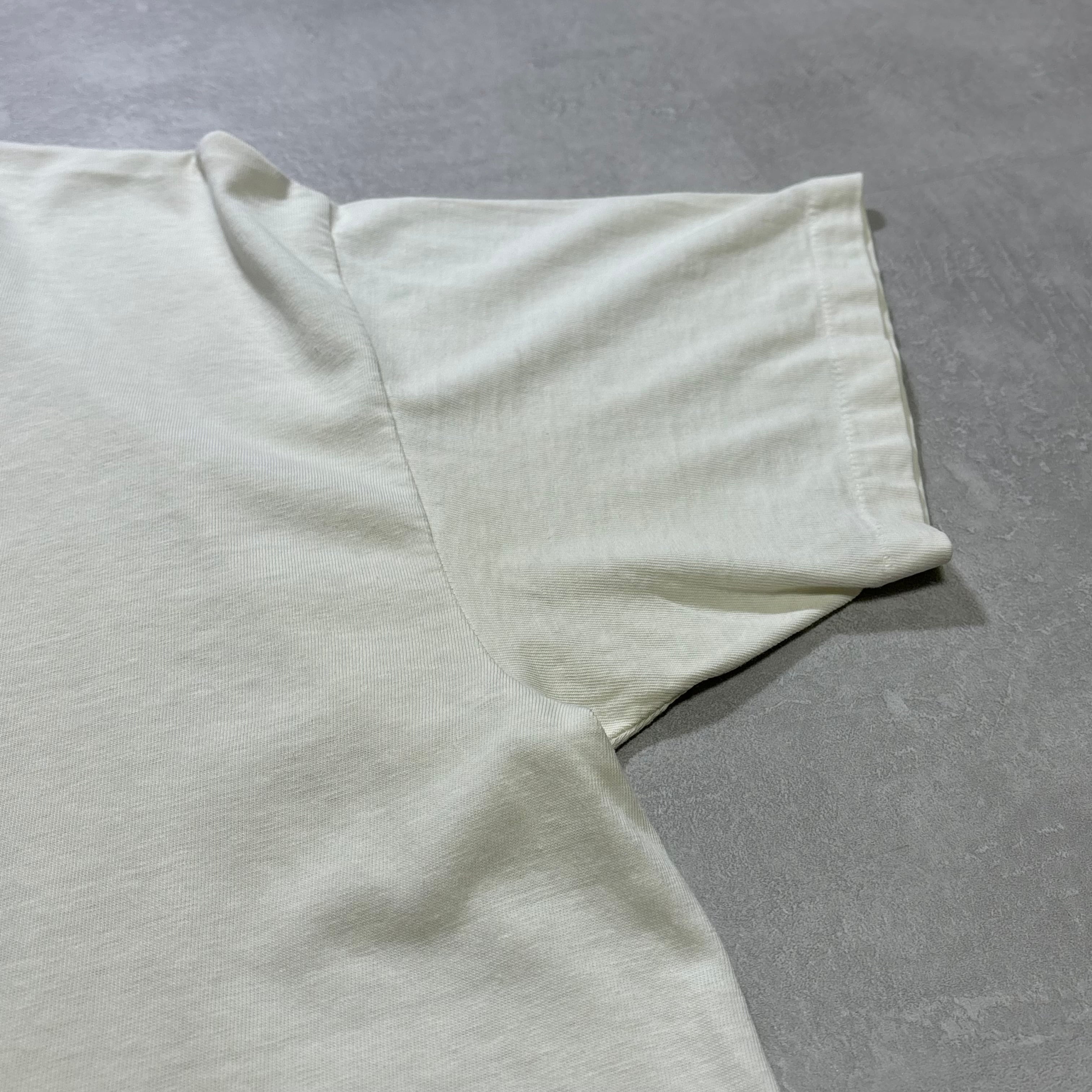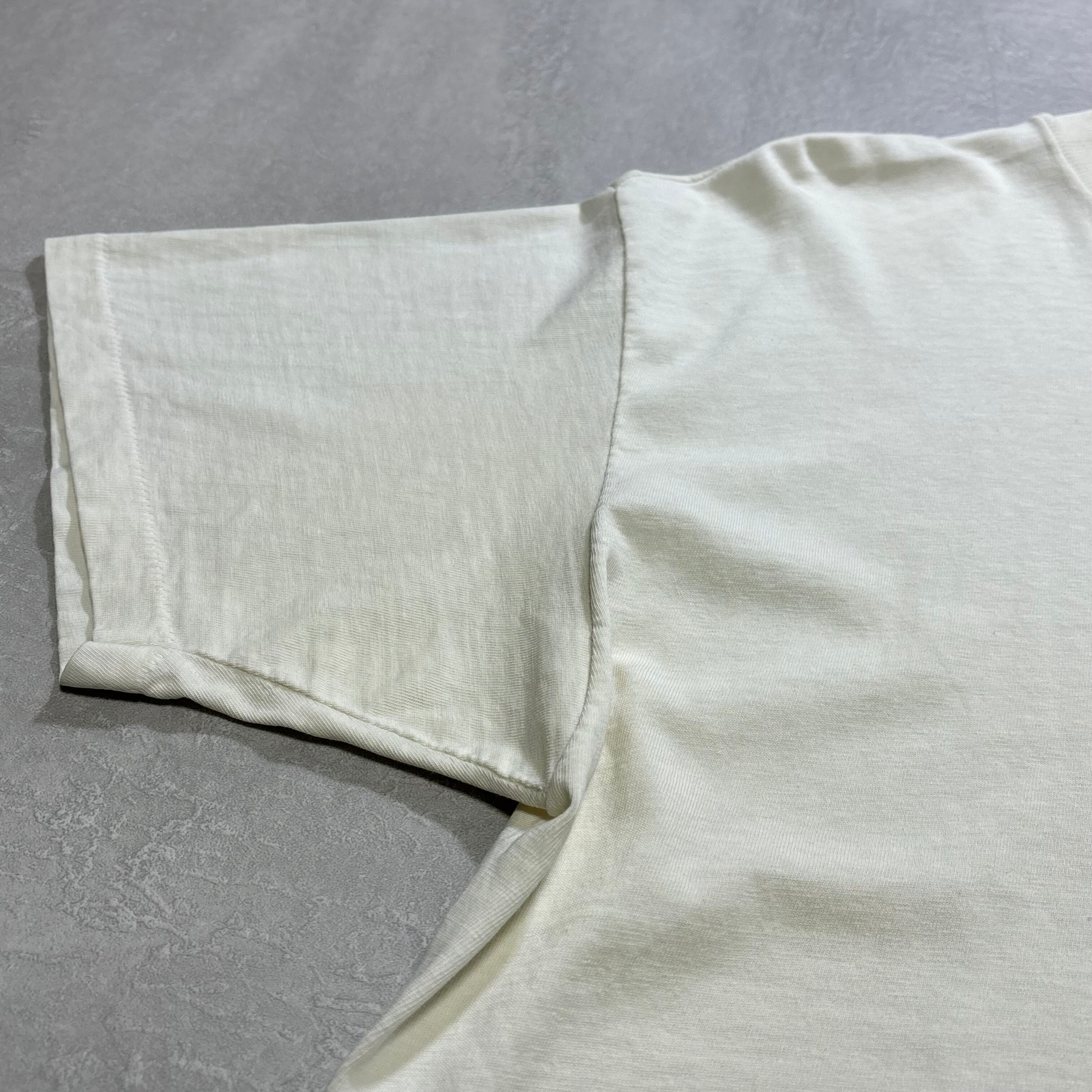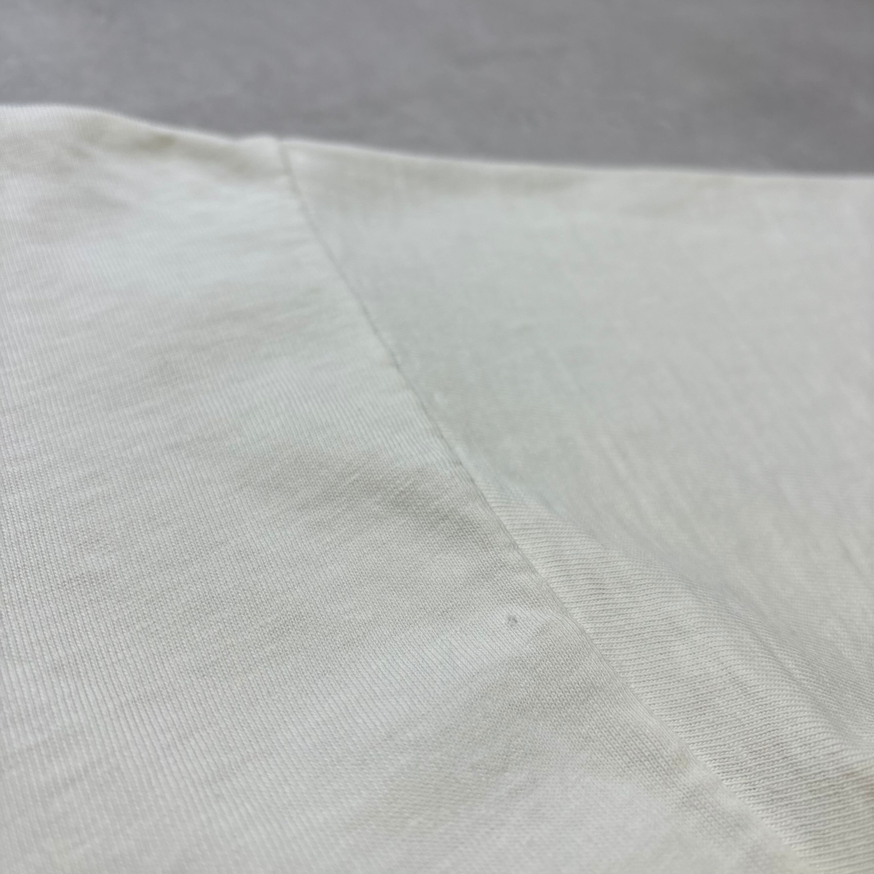 背面右袖付け根付近・左肩にピンホール1カ所ございます。両脇・首周りに薄汚れがございます。(元々生成りボディーです。)