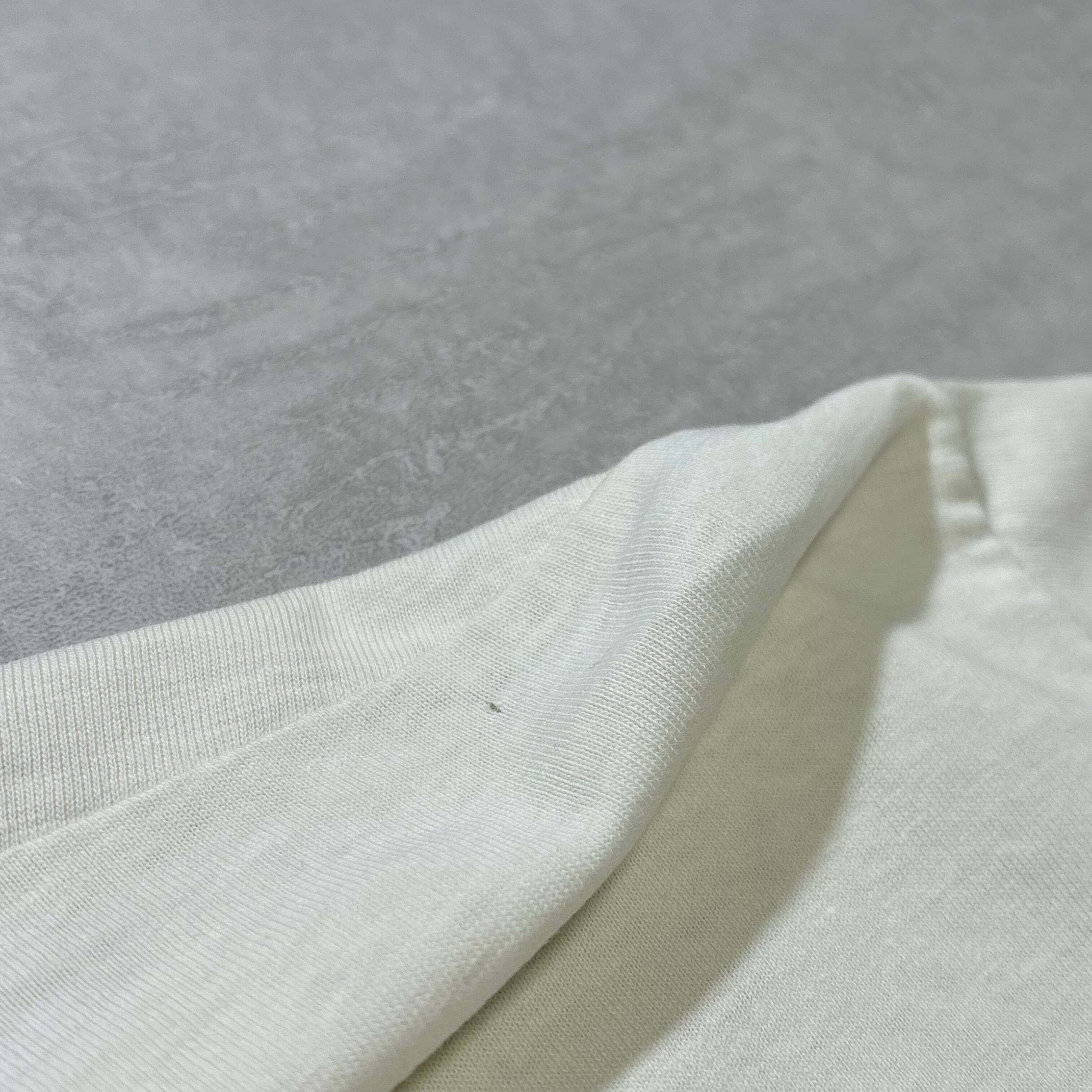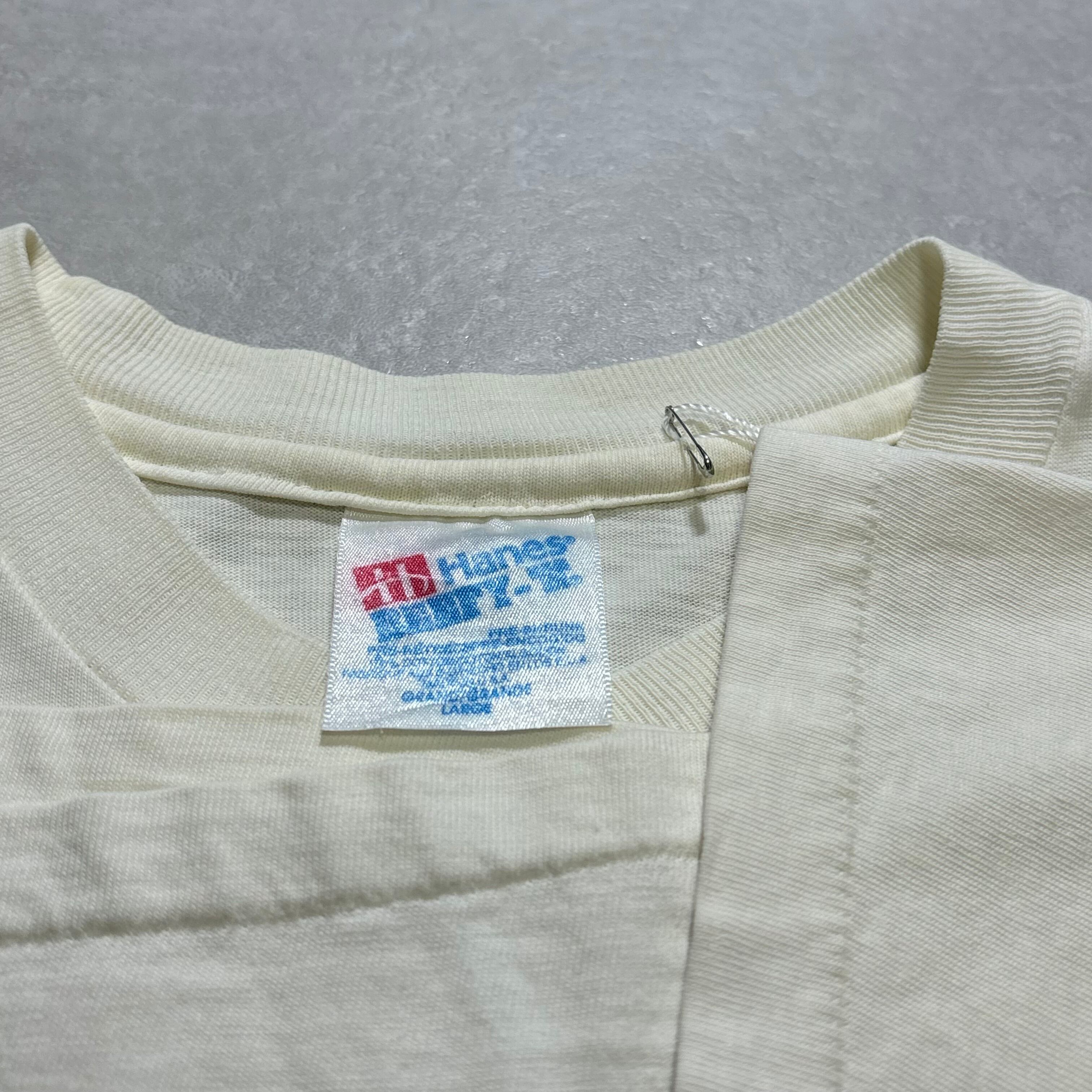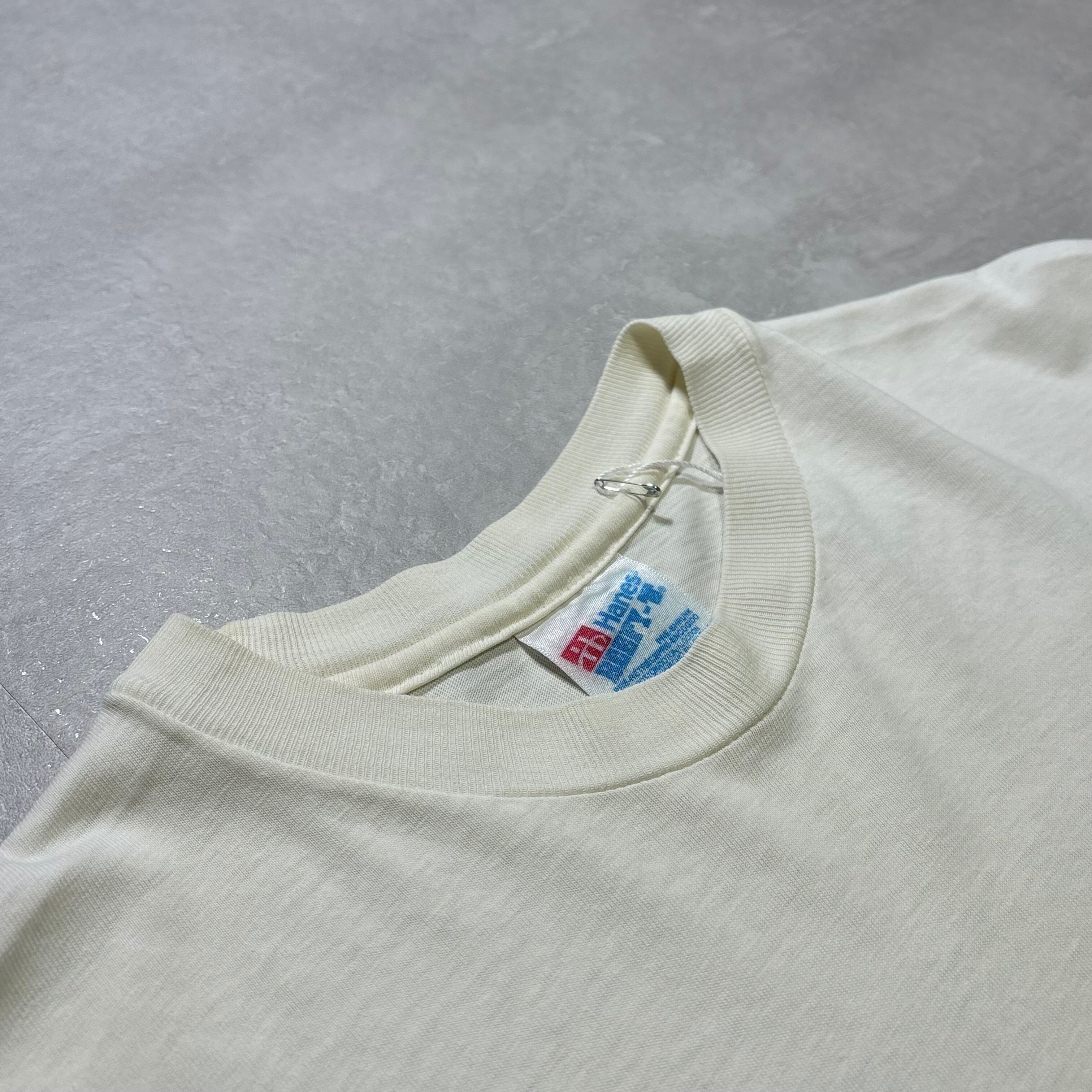 背面右袖付け根付近・左肩にピンホール1カ所ございます。両脇・首周りに薄汚れがございます。(元々生成りボディーです。)